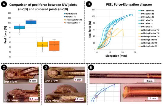 Comparison between properties of wire, UW joints, and soldered joints before and after thermal shock test: (A) peel force, (B) peel-force–elongation curves, fracture of peel-force samples (C) unexposed and (D) exposed to the thermal shock test, (E) the area from which the varnish peeled off and peeled varnish, with the indication (red circle) on the peel force–elongation curve.