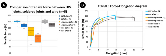 Similar to the peel test results, the UW joints proved stronger than the solder joints. The force–elongation curve (Figure 13B) indicated that the values for both tensile load and elongation decreased post-TS test for both types of joints. In the case of the wire, while the tensile load decreased, the elongation actually increased. For UW, there was a significant reduction in elongation; however, it remained within the range of the soldered samples and still maintained a higher joint strength. The solder joints also showed a larger variance in tensile strength results, which underscores the influence of workers.