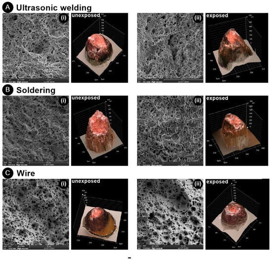 The decrease in tensile load post-TS was further validated when examining the fractures of the specimens. In Figure 14, ductile fractures characterized by microvoid coalescence are evident in all samples. A consistent pattern in fractures A (UW) and B (soldering) was observed both before and after TS. While the fractures appeared ductile based on the force–elongation curve, the curve suggested characteristics of a brittle fracture. For UW, this discrepancy was attributed to the notch effect and the internal stresses present at the fracture. In the case of soldering, this was due to the wire thinning immediately after the joint (at the fracture) as a result of the soldering process itself. A slight difference was noted in the wire fracture in C. Larger microvoids became apparent in the wire that was exposed to TS (Figure 14(C-ii)). This observation is further substantiated by the force–elongation curve, where a greater elongation was recorded in samples that underwent TS.