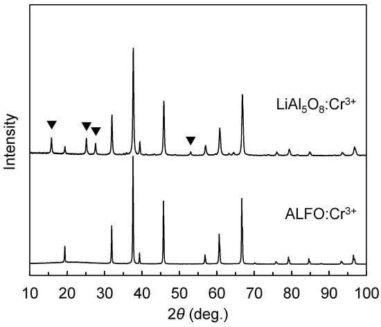 Comparison of XRD patterns of ALFO:Cr3+ and LiAl5O8:Cr3+ prepared at 1200 °C. The peaks marked with ▼ are the extra peaks originating in the cation ordering of Li+ and Al3+ in the spinel-type lattice of LiAl5O8 (see text for details).