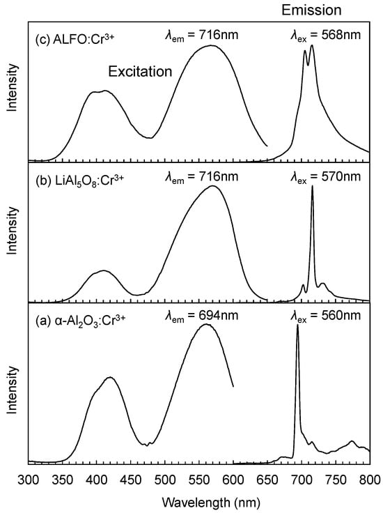 Emission and excitation spectra of 0.5% Cr3+ in α-Al2O3 (a), LiAl5O8 (b), and ALFO (c).
