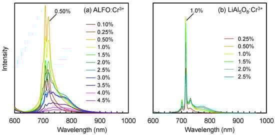 Figure 6 compares the PL spectra of ALFO:Cr3+ (a) and LiAl5O8:Cr3+ (b) at different Cr3+ concentrations. The emission intensity of ALFO:Cr3+ increased from Cr3+ = 0.1% to 0.5% and decreased above 0.5%. Above 2.5%, the intensity of the main doublet peak decreased while the shoulders developed around 780 nm. In the previous literature, it has been discussed that the broad emission of Cr3+ in the near-infrared region was due either to the 4T2 → 4A2 transition of Cr3+ placed in a weak crystal field, or to magnetic interactions between Cr3+ ions at the neighboring sites. According to the Tanabe–Sugano diagram [46,47,48], the first excited state in the d3 configuration of octahedral coordination is the 4T2 or 2E state, depending on the strength of the crystal field. The transition from the 2E state to the 4A2 ground state yields the line spectra typically observed for Cr3+ around 700 nm, while broad near-infrared emission is reported for the transition from the 4T2 state in the host materials with a weak crystal field [21,22,23,24,27,29,30]. Magnetic interactions also bring the red-shift of the emission [49], as exemplified by the so-called N-lines of Cr3+ emission [9,15] and the broad luminescence due to Cr3+-Cr3+ pairs observed in SrAl11.88−xGaxO19:0.12Cr3+ by Rajendran et al., which was concluded from the decay time measurements [28]. As for the shoulder peak around 780 nm in ALFO:Cr3+, the origin was attributed to the magnetic interaction between Cr3+ ions from the fact that the change in the lattice parameter with Cr3+ addition, i.e., the change in the strength of the crystal field at the Cr3+ sites, was not very large (Figure S4 in Supplementary Materials), and that the interaction between Cr3+ ions was observed in the ESR signal at a high Cr3+ concentration as described in Section 3.4.