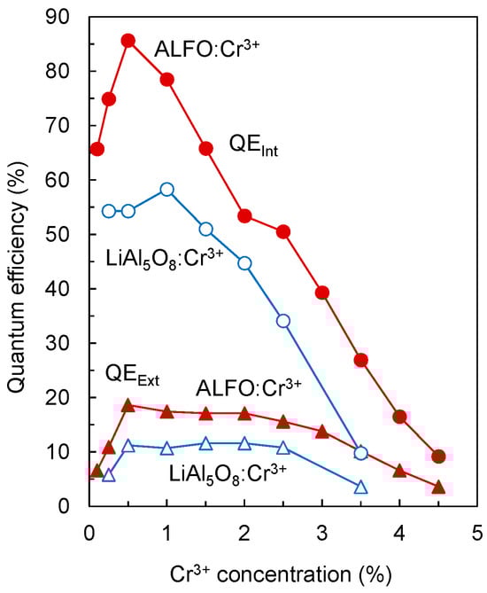 Internal and external quantum efficiencies of ALFO:Cr3+ and LiAl5O8:Cr3+ with different Cr3+ concentrations. QEInt and QEExt represent internal and external quantum efficiencies, respectively.
