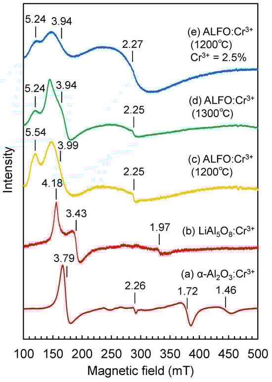 Cr3+ in the d3 configuration is an ESR active ion, and the ESR technique was expected to effectively detect the differences in the electronic structures affected by the coordination environment. Figure 8 compares the ESR spectra of 0.5% Cr3+ doped α-Al2O3 (a), LiAl5O8 (b), and ALFO (c) prepared at 1200 °C. Cr3+ in α-Al2O3 was focused on in the 1960s as a good model example for ESR measurements [44,50,51,52,53,54,55,56,57,58]. The ESR signal of Cr3+ in α-Al2O3 (Figure 8a) was consistent with those reported for Cr3+ in polycrystalline α-Al2O3 in the previous literature [50] and consisted of several peaks corresponding to g = 3.79, 2.26, 1.72, and 1.46. For octahedrally coordinated d3 ions placed in a magnetic field, the lowest energy state is the spin quartet, with the spin quantum number s = −3/2 along the direction of the magnetic field. The signal of a polycrystalline sample is the average of the spectra of individual crystallites, and the angular dependence of Cr3+ in single crystalline Al2O3 [59] indicated that the peaks at g = 3.79 and 2.26 were assigned to the s = −3/2 to −1/2 transition, and the peaks at g = 1.72 and 1.46 to the −1/2 to +1/2 transition and +1/2 to +3/2 transition, respectively (Appendix B) [50,51].