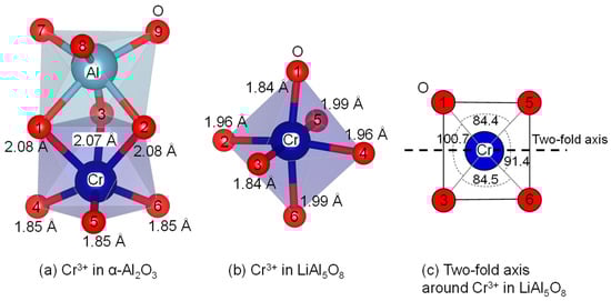 In α-Al2O3, Cr3+ was considered to be placed in a trigonal symmetry as suggested by McClure experimentally [63], which was also reproduced in our MD [39]. The previous literature referred to the rhombic distortion for CrO6 in LiAl5O8 with C2 symmetry [19,45]. Our MD result indicated that Cr3+ was arranged in a monoclinic symmetry that retained a single two-fold axis passing through the midpoints of O1 and O3, and of O5 and O6 (Figure 9b), and the two-fold axis is illustrated on the O1-O3-O6-O5 plane (c). Because of the complexity of the structure, including the disordered arrangement of cations and the presence of vacancies on the anion sites, MD for ALFO has not yet been performed; the local environment around Cr3+ in ALFO was inferred to be similar to that in LiAl5O8, but even more disordered.