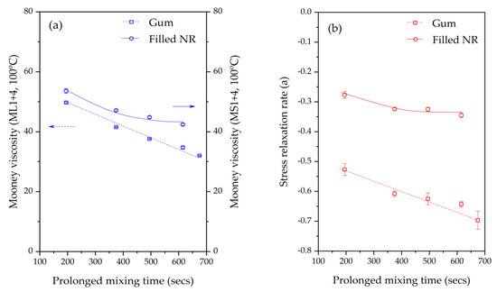 a). The Mooney stress relaxation is a combination of elastic and viscous responses. A higher value of the relaxation rate indicates an increase in the viscous/elastic ratio. Numerous studies of raw rubber and rubber compounds reported that the rate of stress relaxation correlates with the structural characteristics of the rubber, such as the molecular weight, molecular weight distribution, chain branching, and gel content [