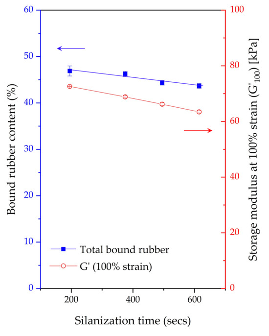The storage shear moduli (G’) of the uncured silica-filled NR compounds obtained from the nonproductive mixing step were evaluated by using an RPA elite dynamic spectrometer (TA Instruments, New Castle, DE, USA) at a temperature of 100 °C, frequency of 0.5 Hz, and various strains in the range of 0.56–100%. The Payne effect, which indicates filler–filler interactions, was calculated by the differences in storage shear moduli at a low strain (0.5%) and high strain (100%) [