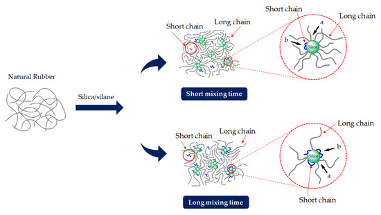 1]. However, the improvement in the compatibility with and good dispersion of silica in a rubber matrix is challenging in compound processing. This is due to the different polarity causing incompatibility between silica and nonpolar rubber, i.e., natural rubber (NR), styrene-butadiene rubber (SBR), and butadiene rubber (BR), which are mostly used in tire treads. To enhance the compatibility and good dispersion of silica in these rubber matrices, bifunctional organosilanes are essential ingredients in silica-filled compounds. In addition, a mixing temperature of about 135–155 °C [