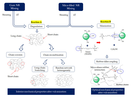 The degradation of NR is a free radical process that can be initiated by several modes, i.e., oxidative, thermal, and chemical. During mixing, the degradation of NR can occur due to mechanical effects: high shear forces during mixing generate heat and initiate rubber chain breakage. Consequently, unstable chain radicals are formed. These radicals are the initiators for further degradation and lead to chain scission, resulting in a decrease in the molecular weight and so deteriorated mechanical properties. All associated factors, chemicals, oxygen, temperature, and time, can contribute to the degradation of NR [