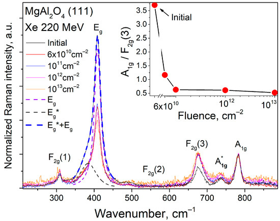 Figure 1 shows that as the SHI fluence increases, there is a decrease in the intensity of vibrational modes associated with defect-free MgAl2O4 and an increase in the intensity of vibrational modes due to induced cationic mixing in the spinel structure (A1g*). The authors of [12] observed a redistribution of intensities between the A1g and F2g(3) modes. They interpreted the F2g(3) mode as a bending mode in the octahedron. The inset of Figure 1 shows that as the SHI fluence increases, the density of states of optical phonons causing the formation of F2g(3) increases, as indicated by the ratio of the areas of the modes. Apparently, the migration of some of the magnesium cations localized in oxygen tetrahedra to the void positions of oxygen octahedra occurred. The most significant changes in the presented relation occur up to a irradiation dose of 1012 cm−2.