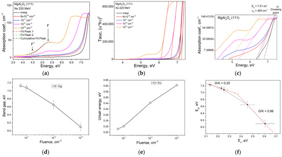 The crystals under investigation were analyzed for their optical absorption, presented in the form of optical absorption coefficient spectra. This enabled a quantitative analysis of the data obtained as well as the calculation of fundamental material parameters such as the optical band gap and the average energy of static and dynamic disorder (Urbach energy). The spectral dependencies of the optical absorption coefficient of MgAl2O4 (111) crystals subjected to SHI are presented in Figure 2a. All the crystals were characterized by high transparency in the visible spectral range. However, significant changes were observed with an increasing irradiation dose in the investigated UV (3–6 eV) and VUV (6–9 eV) ranges. In the UV range, the formation of characteristic F-type centers, representing an anionic vacancy with one (F+) or two (F) trapped electrons, was observed. We studied the behavior of these types of centers in MgAl2O4 (111) crystals in detail in [10]. Particular attention should be paid to the VUV range, where the decrease in the energy of the fundamental absorption edge is clearly traced in Figure 2b. According to first-principles calculations, the extremum of the electron’s energy position in the valence band is located at the Gamma (Г) point of the first Brillouin zone. At the same value of the wave vector k (at the Г point), the minimum is situated in the conduction band [1,17]. The analysis of spectral dependences in Tauc coordinates, as shown in expression (1) [18], showed that direct interband transitions were realized (without a change in the wave vector k ), forming a clear linear section: