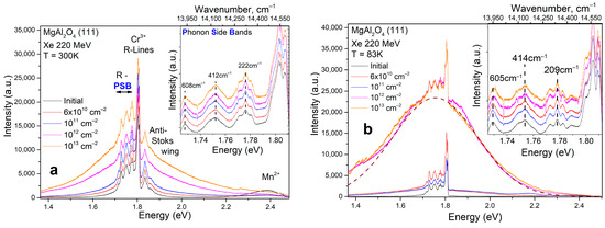 Figure 3. PL spectra upon laser excitation with energy Eex = 2.53 eV of MAS (111) crystals irradiated by 220 MeV Xe ions. The irradiation fluence is shown in color. Measurments made at room temperature (RT) are shown in (a), and those made at 83 K are shown in (b). The insets show the spectral regions corresponding to the Stokes wing of the phonon repetitions of the R-line of Cr3+.
