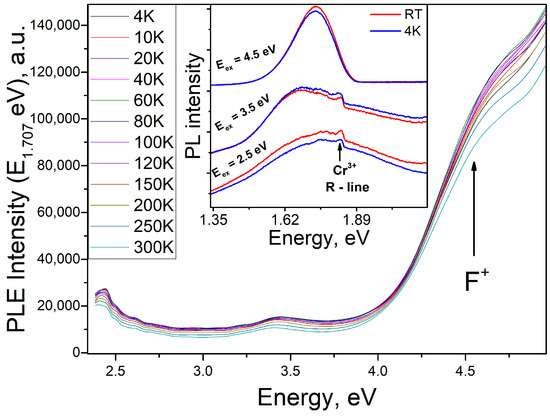 Figure 4. Excitation spectra of 1.707 eV PL band measured at different temperatures. The inset shows the PL spectra at RT (red) and 4 K (blue). The position of the chromium R-line is marked with an arrow.