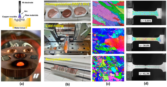 (a) Vacuum arc melting and ingot casting process; (b) homogenization, cold rolling, and recrystallization process; (c) electron backscatter diffraction mapping of the ingot, cold-rolled plate, and fully recrystallized Cu; and (d) digital image correlation during tensile testing.