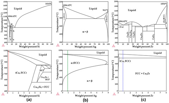 Phase diagrams of (a) Cu–Si, (b) Cu–Ag, (c) and Cu–Zr with compositions ranging from 0 to 100 wt% and 0 to 8 wt%. Dashed lines in the bottom diagrams depict the composition employed in this study.