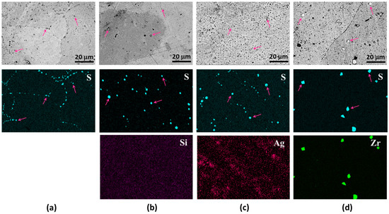 SEM micrographs and EDS maps of as-cast Cu alloys with sulfur addition: (a) Cu-0.2 at% S, (b) Cu-0.5 at% Si-0.2 at% S, (c) Cu-0.5 at% Ag-0.2 at% S, and (d) Cu-0.5 at% Zr-0.2 at% S.