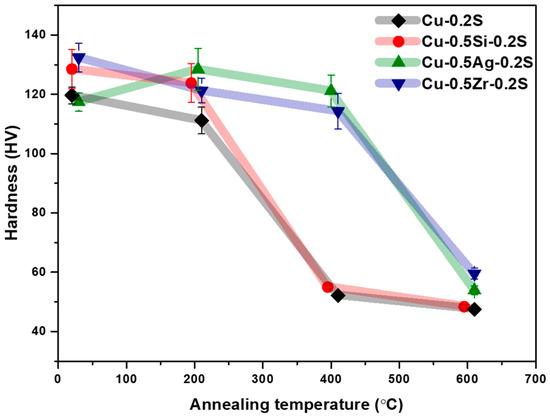The hardness results for the annealed alloys are presented in Figure 5. Notably, the hardness values exhibited a significant decline within a specific temperature range, corresponding to the occurrence of recrystallization. Earlier research findings indicated that recrystallization typically takes place between 300 and 400 °C for Cu–Si alloys, 400 and 500 °C for Cu–Ag alloys, and 500 and 600 °C for Cu–Zr alloys [27]. As demonstrated in Figure 5, both Cu-Ag and Cu-Zr alloys exhibit a suppressed tendency for recrystallization, attributed to the formation of precipitates during the recrystallization process. A prior study elucidated that the addition of Zr to Cu effectively postpones the initiation of recrystallization to higher temperatures. This delay is attributed to the presence of intermetallic Cu5Zr precipitates within the alloys, which inhibit grain boundary movement [28,29].