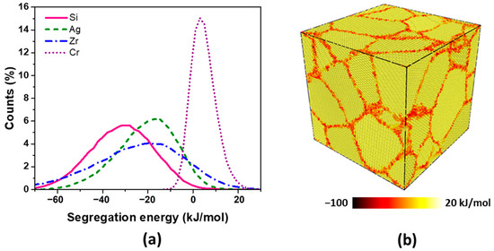 (a) Grain boundary segregation energy spectra for Si, Ag, Zr, and Cr in Cu; (b) Si solute segregation energies in a Cu polycrystal (20 × 20 × 20 nm3 atomistic simulation volume with 16 randomly oriented grains).