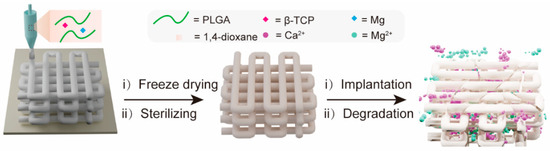 Medical-grade PLGA (70:30, 1.0 ± 0.2 dL/g, Sichuan Dikang Sci-Tech Pharmaceutical Co., Ltd., Chengdu, China), β-TCP (grain size 3 μm, Beijing Deke Daojin Science and Technology Co., Ltd., Beijing, China), Mg powders (100–200 mesh size, Sinopharm Chemical Reagent Co., Ltd., Shanghai, China), and 1, 4-dioxane (99%, ACS reagent, J&K Scientific, Beijing, China) were used as received.