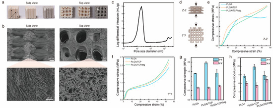 Morphological and mechanical characterization of PTM scaffolds. (a) Side view and top view of different scaffolds, i–iii corresponds to PLGA, PLGA/β-TCP, PLGA/β-TCP/Mg scaffolds, respectively. (b) SEM images of PTM scaffolds. (c) Porosity measurement of PTM scaffolds. (d) Illustration of the compression test from two directions. (e,f) Stress and strain curves of different scaffolds under z–z compression and y–y compression. (g) Compressive strength of different scaffolds. (h) Compressive modulus of different scaffolds.