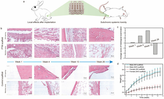 (a) Illustration of the implantation of scaffolds in the local and systemic toxicity evaluation tests. (b) H&E staining images of PTM and control scaffolds implanted in the femur of rabbits at different time intervals. (c) Histological scoring of the PTM scaffolds at different time intervals. (d) The weight change of SD rats in the subchronic systemic toxicity tests.