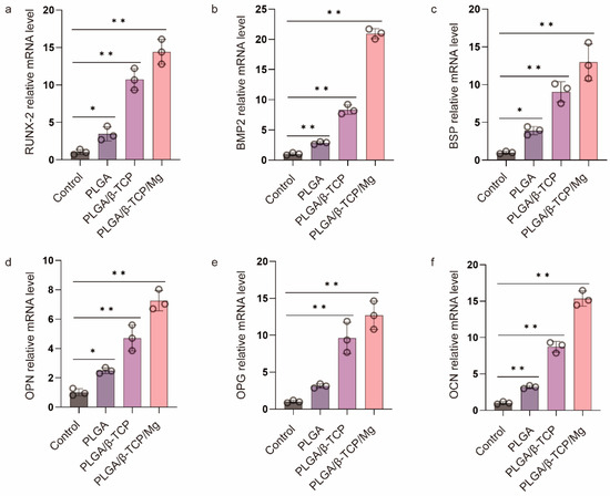 The osteogenic differentiation of scaffolds was assessed by culturing MC3T3-E1 cells (Subclone 14, CRL-2594, American Type Culture Collection, Manassas, VA, USA) with the leaching solution of the scaffolds and quantifying the mRNA transcript levels of osteogenic specific genes according to the literature with minor modifications [39]. Briefly, the leaching solution of the scaffolds was prepared by incubating the scaffolds in the MEM Alpha medium (α-MEM, Gibco, Waltham, MA, USA, A10490-01) containing 10% FBS (Gibco, Waltham, MA, USA, 10099-141) and 1% PS (Hyclone, Marlborough, MA, USA, SV30010) at 37 °C for 72 h. Then, the leaching solution was diluted 10 times with the α-MEM solution supplemented with 10 mmol/L β-Glycerophosphate disodium salt (Sigma-Aldrich, St. Louis, MO, USA, G9422), 50 μg/mL ascorbic acid (Sigma-Aldrich, St. Louis, MO, USA, A4544), and 10 nmol/L dexamethasone (Sigma-Aldrich, St. Louis, MO, USA, D4902) to reduce the cytotoxicity of Mg [40]. For the in vitro osteogenic differentiation, MC3T3-E1 cells at a density of 4 × 104 were seeded in 12-well plates and incubated with α-MEM basal medium for 72 h. Then, the basal medium was changed to the diluted leaching solution and we continued incubating the cells for 7 days. The culturing medium was changed every two days. Then, the cells were collected, and the total RNA was extracted using the TRIZOL reagent (H10318, TransGen Biotech, Beijing, China), followed by reverse transcribing the total mRNA into cDNA using the FastKing-RTSuperMix (KR118-02, TIANGEN BIOTECH (Beijing) Co., Ltd., Beijing, China). cDNA template and specific primers (Table S17) were synthesized by Shanghai Generay Biotechnology Co., Ltd., Shanghai, China. The mRNA levels of all genes were normalized to the target gene (GAPDH).