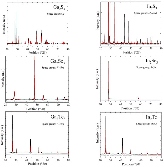 X-ray diffraction patterns of indium and gallium chalcogenides (black) and their Rietveld refinement (calculated profile—red, difference profile—gray).