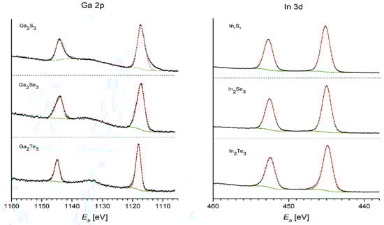The composition of all six materials was further confirmed with X-ray photoelectron spectroscopy (XPS) using a SPECS spectrometer equipped with a monochromatic Al Kα X-ray source (1486.7 eV) and a hemispherical electron analyzer, Phoibos 150. Figure 3 displays high-resolution spectra of Ga-2p and In-3d core regions of the materials. In the gallium-containing chalcogenides, two broad signals are evident—the Ga-2p3/2 and Ga-2p1/2 core levels are situated at approximately 1118 and 1145 eV, respectively, and could be fitted with a single component each. Similarly, the spectra of the indium-based chalcogenides exhibit two broad signals—the In-3d5/2 and In-3d3/2 core levels are located at approximately 453 and 445 eV, respectively. Like the gallium derivatives, these could be fitted with a single component each. The binding energy values correspond to the expected values for this class of compounds.