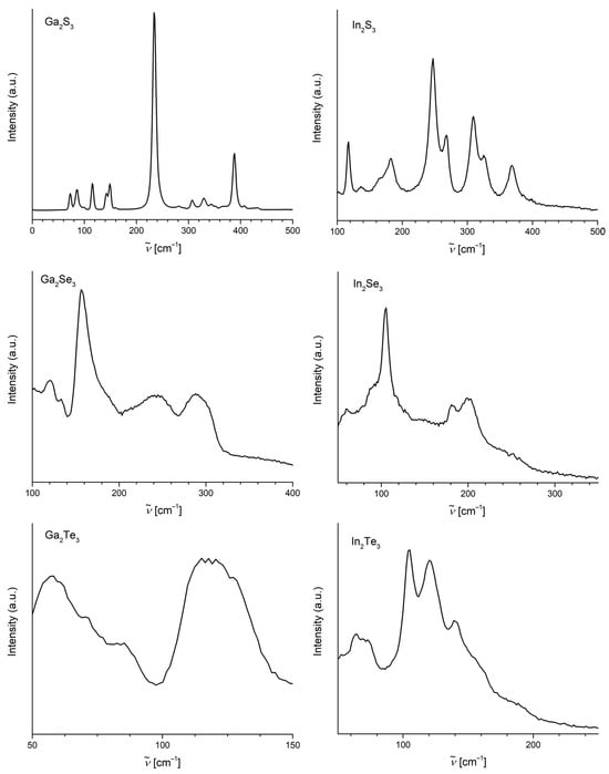 The Raman spectra of all the chalcogenides were recorded using a 532 nm Nd laser with low incident power and a 20× objective lens. There are two main resonance peaks in the spectrum of Ga2S3 (Figure 4) identified at 235 and 389 cm−1, assigned to the A1 and F2 modes, respectively [], accompanied with several lower intensity peaks in the regions 70–170 and 300–360 cm−1. The spectra of the other two gallium(III) chalcogenides, Ga2Se3 and Ga2Te3, contain no sharp peaks but not-well-resolved broad signals with the maximum intensities at 157, 243, and 290 cm−1 for the selenide and 58 and 118 cm−1 for the telluride. The shape and quality of these spectra correspond to the data reported [,]. In the Raman spectrum of In2S3, there are several well-resolved peaks that could be assigned to the A1g modes (245, 309, and 369 cm−1), Eg mode (269 cm−1), and F2g modes (117, 183, and 326 cm−1) []. Similarly to the heavier gallium chalcogenides, the spectra of indium selenide and telluride are also less resolved than the spectrum of the sulfide (Figure 4). In the spectrum of In2Se3, there are three major signals at 106, 181, and 200 cm−1 assigned to the A1 modes []. The spectrum of In2Te3 corresponds to the only reported spectrum of this compound [], with four main features at 63, 105, 121, and 140 cm−1.