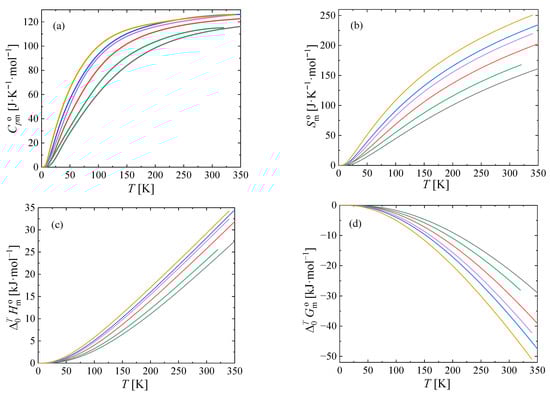The thermodynamic functions obtained using Equations (1) and (2) are tabulated at 298.15 K in Table 4, and at other temperatures in Tables S13–S18 in the SM, and shown in Figure 5.