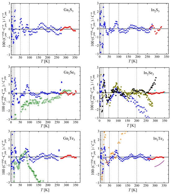 The results were compared with available literature (see Figure 6). A handbook by Knacke et al. [] provides parameters for the heat capacity of these chalcogenides in a wide temperature range. These values differ significantly from our measurements (by 4 to 20%) with the exception of In2Te3, which agreed with our measurements within 1% in the range of overlap—from 300 to 350 K. The adiabatic heat capacity data by Tyurin et al. [] agree with our measurements within 2% above 50 K in the case of Ga2Se3. Below 50 K, the difference increases to 20% at 15 K, the lowest point of Tyurin et al. []. Therefore, we decided not to include this data set in our correlation. On the other hand, adiabatic data by Tyurin et al. [], Koschenko et al. [], Boenke et al. [], and Zlomanov et al. [] are in good agreement with our measurements, with the exception of the tellurides (Ga2Te3, In2Te3), which deviate for temperatures above 100 K (with maximum deviation of 5% for In2Te3 [] and 9% for Ga2Te3 []). However, at temperatures lower than 100 K, the agreement is also very good. The reason for the discrepancy observed above 100 K remains unclear and requires further elucidation.