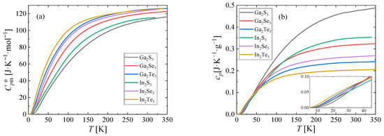 As we can see in Figure 7a, the order of heat capacities (from highest to lowest) is In2 > Ga2 and Te3 > Se3 > S3. This clear trend is a manifestation of (i) increasing molar masses (M(Ga2S3) = 235.64; M(In2Te3) = 612.44) and (ii) softer force constants related to chemical bond weakening with increasing atomic size (due to less effective valence orbital overlap), both resulting in an enhanced phonon mode population at lower temperatures. In contrast, if we compare their specific heat capacities instead (Figure 7b), we obtain an exact opposite order at ambient temperatures. Interestingly, the specific heat capacities cross over at about 40 K and at very low temperatures, the order of specific heat capacities being the same as for molar heat capacities (see the inset of Figure 7b).