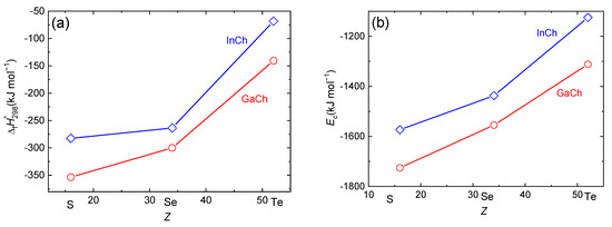 The calculated enthalpies of formation at 298 K and cohesive energies at 0 K referred, respectively, to elements in their stable solid forms and to a noninteracting monoatomic gas are plotted in Figure 8a,b against the atomic number of chalcogen. In both cases, a decreasing stability with an increasing atomic number of group 16 as well as group 13 elements is apparently a result of decreasing strength of the covalent bond due to a less effective overlap of more diffused valence orbitals, which is also in line with the observed trend in molar heat capacities.