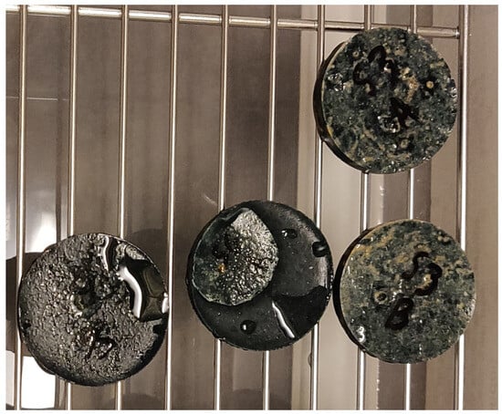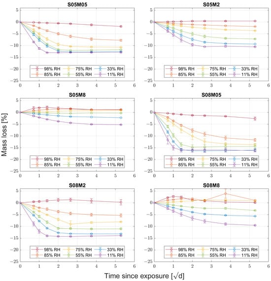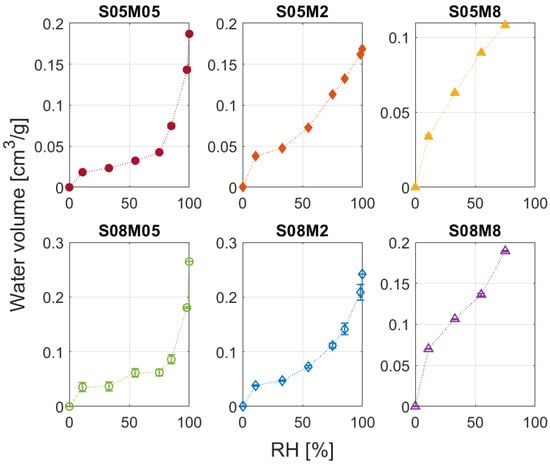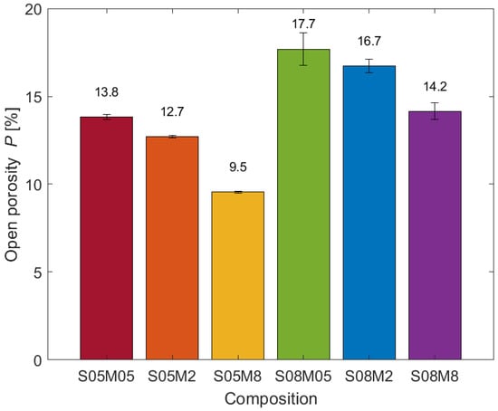 - S08M05 does not present the highest open porosity value as it did during the open porosity test; a possible reason for this is that preliminary tests showed very low mechanical strength that may have allowed for a higher cracking formation during the drying phase in the oven, causing an increase in the number of connected pores and a subsequent higher mass loss. Specifically, the shrinkage experienced by the material due to the drying process leads to the appearance of tensile stresses that can cause the formation of microcracks, especially for materials with very low tensile strength [5]. As a consequence, the microcracks may increase the volume of open pores observed during the test [77,78]. S05M05 shows the same behaviour if compared to low s/b compositions.