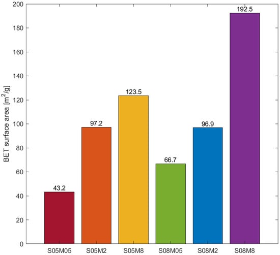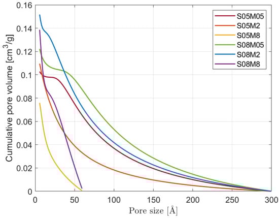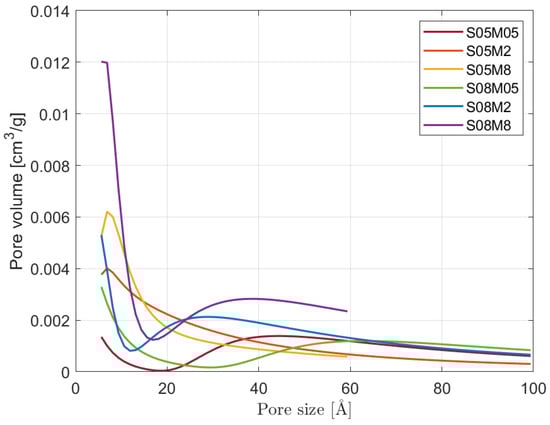 - Note that 0.5 M compositions present a small number of micropores compared to the other compositions. The results are in line with what was observed for the porosity and the BET surface area: even though S08M05 presents the highest porosity, its surface area is relatively small due to a coarser pore structure, as visible in Figure 10.