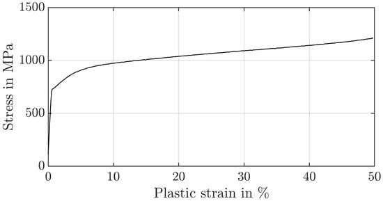 Regarding failure mechanisms of ductile material in general the relationship between equivalent strain at fracture and stress triaxiality (normalised hydrostatic pressure) has been investigated for many metallic alloys by various authors [,,]. thereby defines the hydrostatic stress and the equivalent stress. A decreasing strain with increasing stress triaxiality was found for high-stress triaxiality (). One of the best-known failure models with monotonic behaviour is that of Johnson–Cook [], which is an extended version of the model from Rice and Tracey [] and is dependent on temperature and strain rate. The analytical correlation between fracture strain and stress triaxiality by neglecting temperature and strain rate-dependent effects is