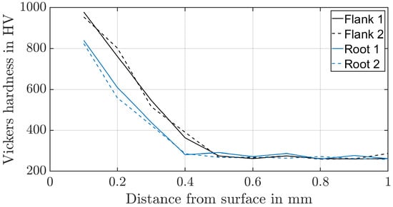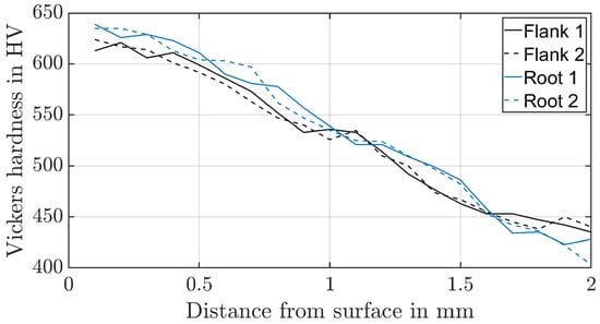 To identify the material properties of the surface layers, Vickers indenter tests based on DIN EN 18203:2022-07 [] are carried out. A Vickers hardness of HV1 is used for the planet and sun, and a Vickers hardness of HV0.5 is used for the ring gear (Figure 4 and Figure 5). Two hardness profiles, each on different teeth, were investigated both in the tooth root and in the upper area of the tooth flank. The stress–strain curve obtained from the compression test, and the Vickers hardness of the core are used to validate the applicability of the reevaluation strategy based on the Equation (1) and the constraint factor and the representative strain of Mata et al. []. The relative error between the converted Vickers hardness and the measured yield stress of the compression test is about 1% for the ring gear material. The core area of the externally toothed gears was influenced by case hardening as well. For this reason, no error can be calculated.