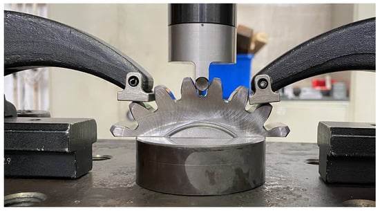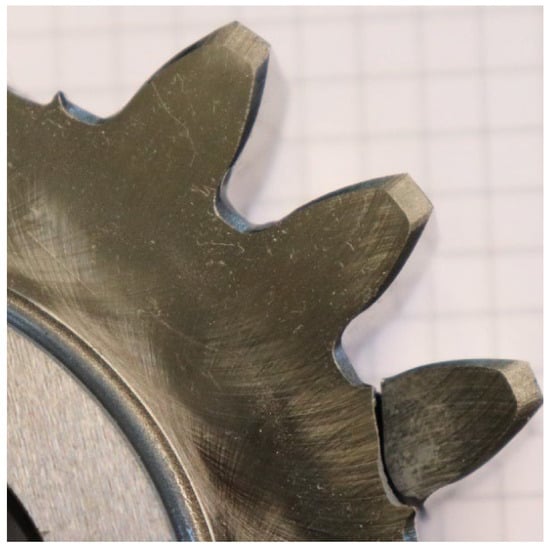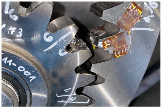The tooth root failure is one of the typical failure phenomena known in the literature, which can occur with overload. The crack initiation point is located on the surface of the tooth root. The strength of the tooth root can be estimated based on ISO6336/3 or American Gear Manufacturers Association (AGMA) or according to contact analysis based on higher-order deformation theory, which is known to be more precise []. Some researchers use quasi-static pulsator tests as an analogue test to document the cracking behaviour of spur gears []. Here, the maximum tooth root strength can be determined by continuously increasing the force until an initial crack occurs.