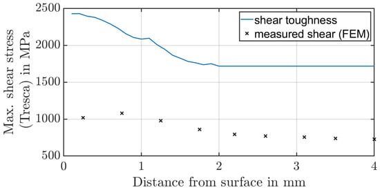 Since failure of the gear is expected at the flank and root, the fracture locus of the surface-hardened gear is to be determined by analogous tests for overload fracture of gears. The quasi-static pulsator test is a suitable analogue test for root fracture. Using the simplified analytical calculation rule of Equation (2) and the calibrated value of Witzig [], it can be deduced that even without considering the residual compressive stresses, the induced loads should not lead to a crack characteristic comparable to flank fracture (Figure 9). Since there is no analytical calculation rule or analogous test for facing edge tooth flank fracture that can be utilised for such a fragment-tooth contact, the Fragment-Ingestion Test (FIT) is used to determine the risk of fracture at the flank. The experiments use real gears with residual stresses that affect the strength of the material. Since the comparison between the experiment and the numerical simulation is based on the displacement of the fragment and the force required, and thus the same deformation state is present, it is assumed that this effect is indirectly considered by a shift caused by the constant residual stresses within the strains and stresses of the numerical model compared to the experiment. Since no effect on the initial crack position could be detected, as will be shown later in the paper, it is assumed that a displacement of the occurring stresses due to residual stresses will not affect the initial crack position.