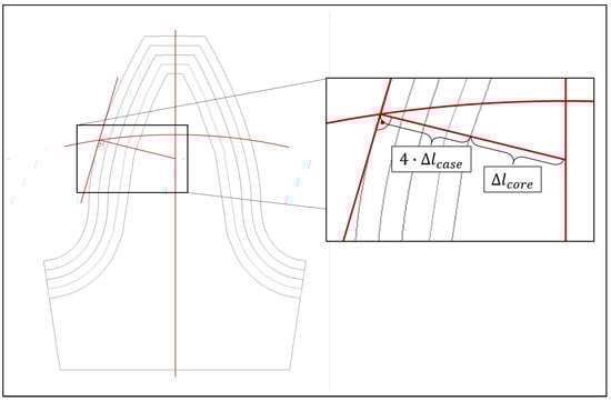 Due to the asymmetric load and the missing possibility of superposition, the entire planetary gearbox needs to be modelled. Taking the surface layer into account would lead to an excessively long calculation time. For this reason, a homogenised material model is used, and the number of elements is reduced to ten elements along the flank. To find the homogenised material properties based on the layered model, the rule of the mixture is modified based on the tooth geometry (Figure 13). For this purpose, the corresponding lengths are determined at the level of the pitch circle diameter, perpendicular to the tangent of the tooth flank. The homogenised yield stress is thus given by
