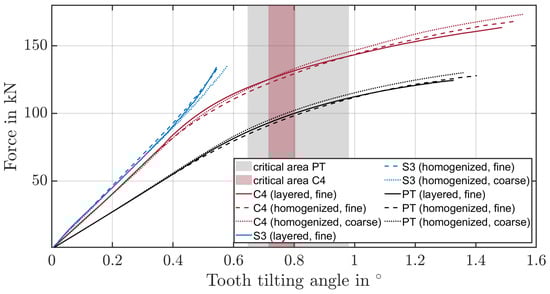 According to ISO 6336-3 [], the tooth root stress depends on the nominal tangential force. This force generates a tilting deflection around the tooth root at the contact point. The tooth remains rigid and only the gear body deforms []. Since the contact point changes continuously during fragment ingestion, a tooth tilting angle is considered subsequently. Therefore, the required force-to-tooth tilting angle of the layered and homogenised models of the path-controlled pulsator test, as well as the FIT, were compared (Figure 14). The critical areas for the C4 fragment and the pulsator test are determined based on the maximum forces resulting in the experiments up to the point of fracture. The tooth tilting angle remains below the critical range for the spherical fragment S3. Here, the plastic deformation at the flank due to the point contact is the dominant effect. The relative error of the forces between the layered fine-mesh model and the homogenised fine- and coarse-mesh model at the mean fracture force is about 2% for the pulsator test and about 5% for the FIT. Overall, the material stiffness of the homogenised model is underestimated in both tests for small deformations and overestimated for large deformations that lead to plastic deformations in the core of the gear. Thus, the material properties for small deformations would have to be those of the surface layer and for large deformations those of the core material.