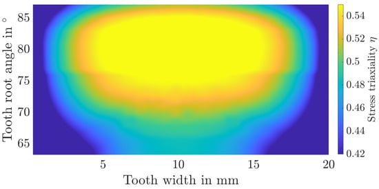 Distribution of the stress triaxiality over the tooth root area for the homogenised material model.