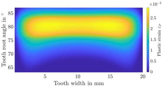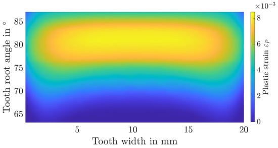 Additionally, the distribution of stress triaxialities as well as plastic strains over the tooth root is shown in Figure 15, Figure 16, Figure 17 and Figure 18. The tooth root angle is defined analogously to the initial crack location angle of Lewicki []. By homogenising the material and thus averaging the yield stresses, plastic deformation is higher overall. However, the local position of the maximum plastic strain remains comparable. The stress triaxiality increases slightly overall, the locale maximum remains comparable here as well. Within the numerical simulation, the maximum plastic strain or stress triaxiality, and therefore the initial crack position, is at a tooth root angle of 81.3°. In the experiments, the initial crack position was determined to be at an angle of approximately 82°. It can therefore be assumed that the initial crack location remains unaffected by the homogenisation.