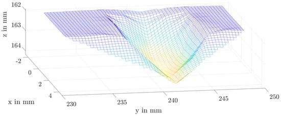 For the experimental results, the penetration depth is measured by a laser sensor. Here, the sensor is moved along the tooth width. The results for the spherical fragments are shown in Table 7. When ingesting a spherical fragment with a diameter of and an axial position relative to the gear width of and , the material fails at the tooth tip edge and begins to yield strongly due to softening and therefore it is not possible to measure any ingestion depth. According to Table 2, there are thus four tests with a spherical fragment in which the penetration depth can be compared. The average deviation of these depths is . The consolidation behaviour of the implemented material thus agrees very well with the experimental results.