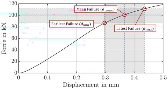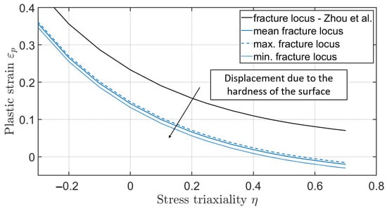 To determine the shift of the fracture locus due to the heat treatment, the fracture stain and the associated stress triaxiality value for the initial crack at the tooth root must first be determined. By comparing the measured forces in the pulsator experiment with the forces of the numerical model, these values can be determined from the numerical model. Based on the results of the numerical simulation a plane strain state can be assumed for the pulsator test []. To reduce the error due to the notch effect on the facing edge, the fracture strain is calculated based on the strain state in the centre of the gear. Figure 20 shows the force-displacement characteristic from the numerical simulation of the quasi-static pulsator test. The critical area is marked based on the forces at which the gear failed in the experiment and the corresponding displacements. Taking into account the scattering of the measured crack initiation times, the earliest crack in the experiment occurred at a displacement of , and the latest crack was at . Accordingly, the average indentation depth is . For later investigations, the critical range instead of the mean value is considered. In the numerical simulation, no plastic strains occur at the displacement . The first plastic strain appears at a force of and a displacement of . The minimum fracture locus will be determined based on this penetration depth. Therefore, the minimum fracture strain is with a stress triaxiality of . For the averaged value of , the mean fracture strain is with a stress triaxiality of . For the maximum force required to crack, the value of the maximum fracture strain is with a stress triaxiality of . By shifting the curve known from Zhou [], the fracture locus for the layered material can thus be determined (Figure 21). Noticeably, the curve turns into negative fracture strains for stress triaxialities of around due to the axial displacement. The negative values result from the brittle material behaviour at high-stress triaxialities. This means any plastic deformation immediately leads to fracture.