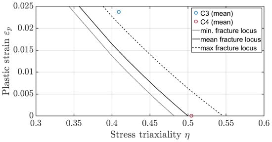 The FIT strain state is used as a reference to validate the fracture locus determined from the pulsator test. Both root and flank fractures occurred during the test. Therefore, fracture strains are measured for different stress triaxiality states. First, the critical strain state at the root is compared with the determined fracture locus. It should be noted that although a plane strain state is also present for fragment C4, this assumption no longer holds for fragment C3. In this case, the length of the fragment is no longer equal to the width of the gear. Therefore, the fracture strains measured by FIT are expected to exceed the critical fracture strains determined from the pulsator test, as an axisymmetric stress state is present and, according to Xue et al. [], the fracture locus is therefore above that of a plane strain state.