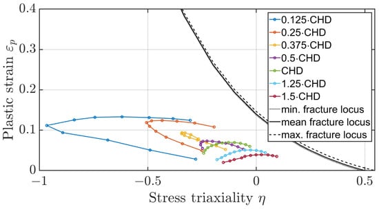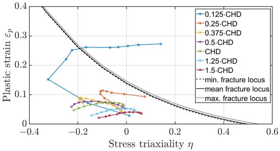 Xue et al. [] confirmed that a plane and an axisymmetric stress state lead to different parameters of the failure model, with the axisymmetric being the upper bound () and the plane strain state being the lower bound () of the failure strain. The parameter refers to the stress state. The two states and depend on different parameters of the failure model (Figure 1).