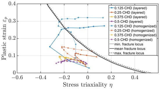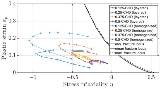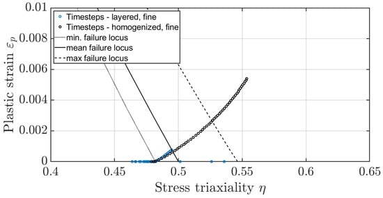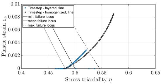 Comparison of plastic strain-to-stress triaxiality for layered and homogenised flank elements at a distance of 1.5 mm of the edge at .