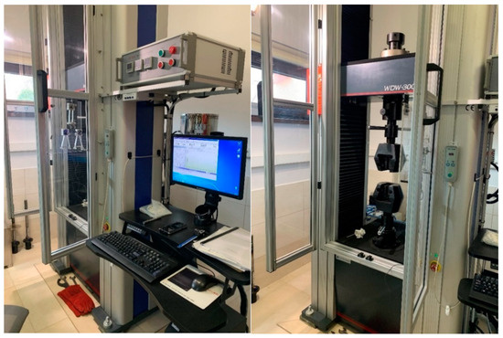 The experimental verification of the yield limit and the ultimate strength limit exhibited by duplex steels after a simulated fire incident and selected for detailed analysis was conducted on the strength testing machine WDW-300E, capable of generating a maximum tensile force of 300 kN (Figure 1). The lower index Θ denotes an earlier action of fire temperature on the tested specimen, while the upper index denotes that the indicated quantity is determined on the sample effectively cooled after surviving a simulated fire incident. The tested “fivefold” samples of normalized shape and dimensions [34] (Figure 2) were cut from hot-rolled steel plates.