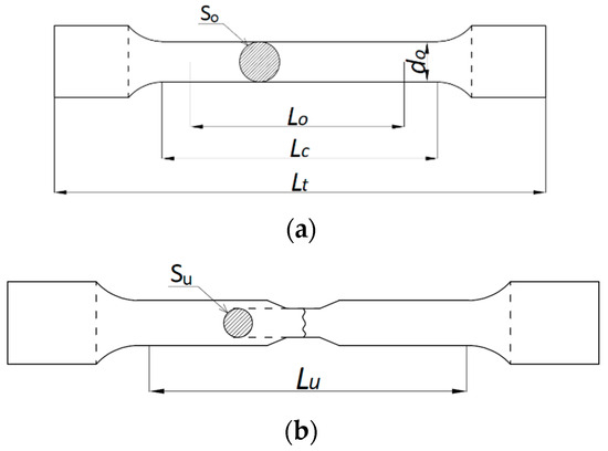 A detailed juxtaposition of the experimentally determined material parameters describing the post-fire mechanical properties of X2CrNiMoN22-5-3 steel is listed in Table 2, where denotes the relative elongation of the sample, measured with respect to its total length Lt (Figure 2), and denotes the relative elongation of the initial measurement base, measured on the broken sample (Figure 2).
